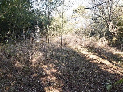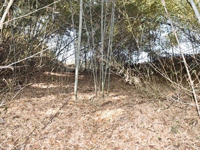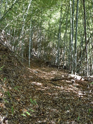 腐った木橋を渡り、藪の中に。写真はフラッシュ使ってるから明るいが、実際はうっそうとした竹林の中を進む。竹が倒れてるので歩きづらい。道があるから進んでいったら行き止まりだった。