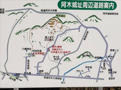 14時18分の列車(電車ではない)に乗って次の目的地・阿木には25分の着。この時間になると列車混んでたなあ。駅前に案内板。あれ阿木城は結構登りキツいのかな?(下調べゼロ)