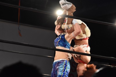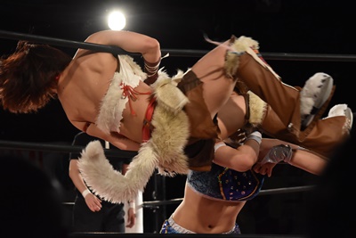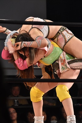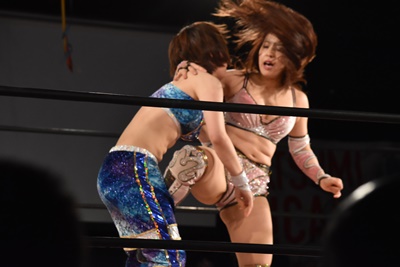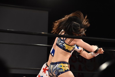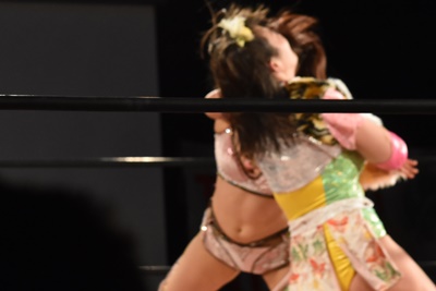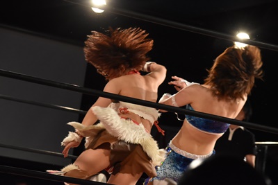 ちゃんみなインプラントDDT狙う、うなブロック、ロープに飛ぶ、ちゃんみなカウンターのフライングクロスアタック(右写真)。両軍タッチ。
