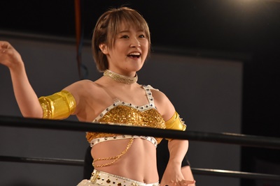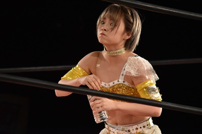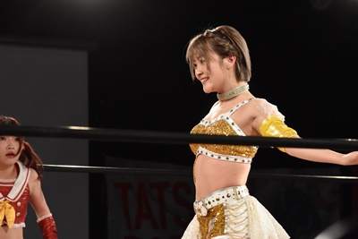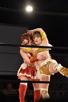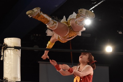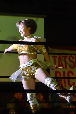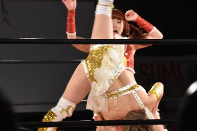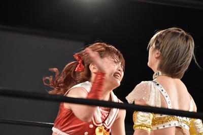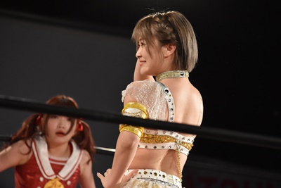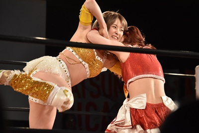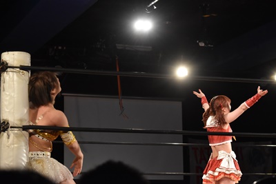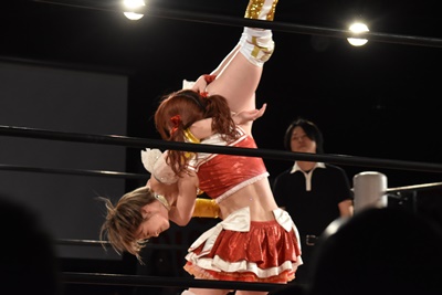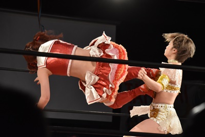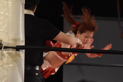 なつぽい側宙(左写真)からのアームホイップ、伊藤ちゃん場外に。