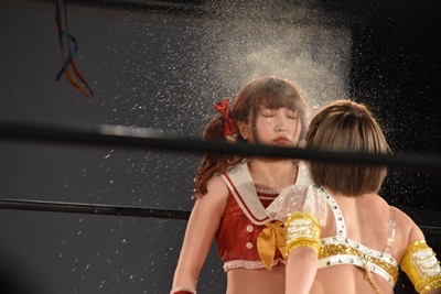なつぽい低空ドロップキックで伊藤ちゃんをダウンさせると口に水を含み(左写真)、