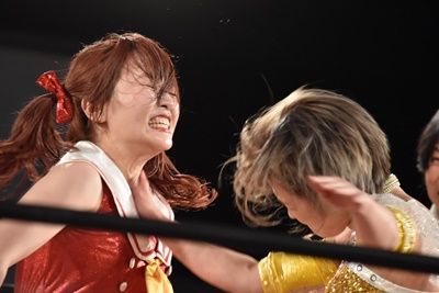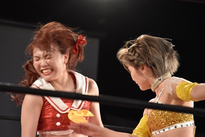 伊藤ちゃんがリングに戻るとなつぽいは髪をつかみ(右写真)、