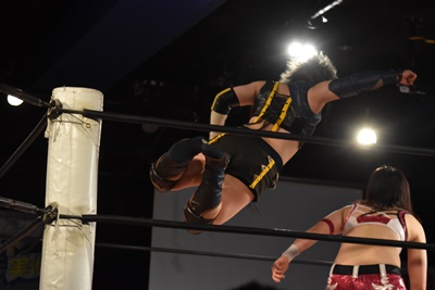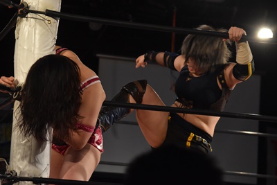 リングに戻るとのどかは山下をターンバックルにぶつけ(左写真)、