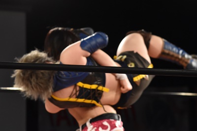 山下「なんとか8回目、防衛することができました。ここまできたら2ケタいきたいなって思ってるんですけど。9度目の防衛戦、今回も指名しちゃおうか。まず、場所は3月31日、私の地元である博多スターレーンでやりたいと思ってます。その相手、私の中で決まってるのはユカちゃん。本人しだいなんだけど。」(左写真)