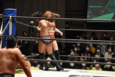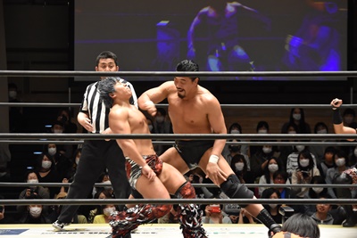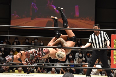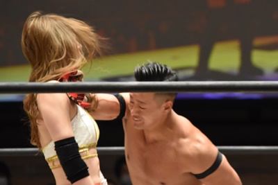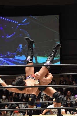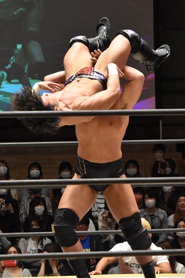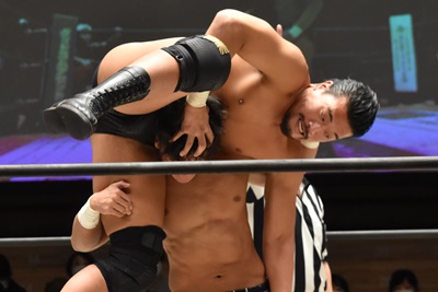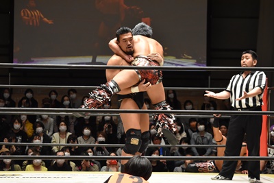 T-Hawk逆水平、ブレーンバスター狙う、赤井切り返して逆にブレーンバスターで投げる(左写真)。樋口にタッチ。5分経過。