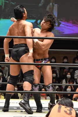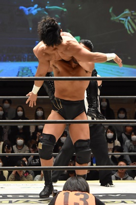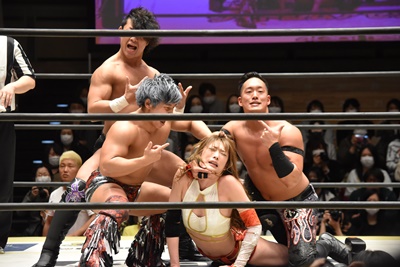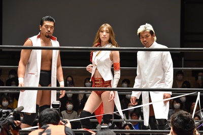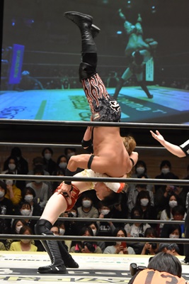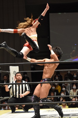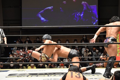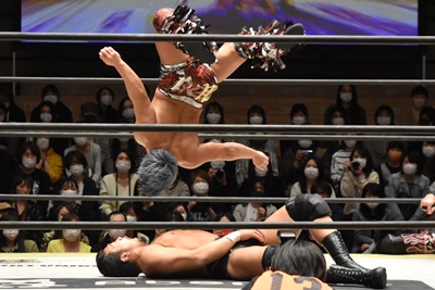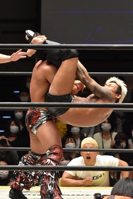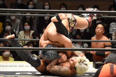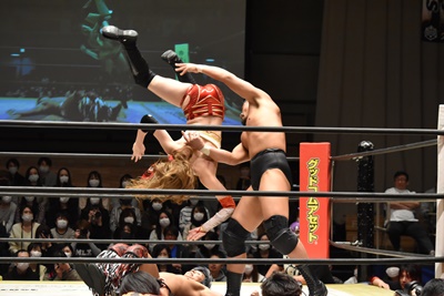 T-Hawkが赤井を捕らえ島谷がミサイルキック(左写真)。