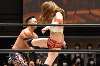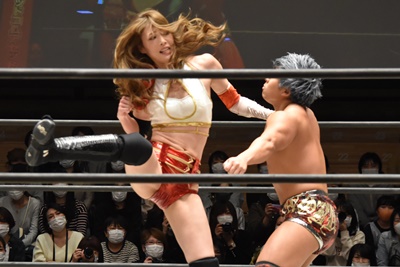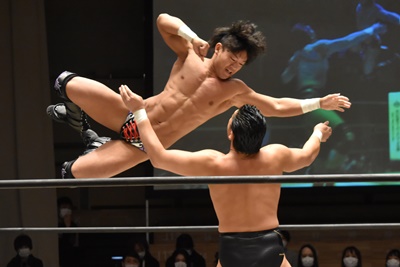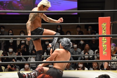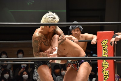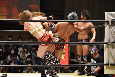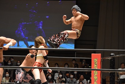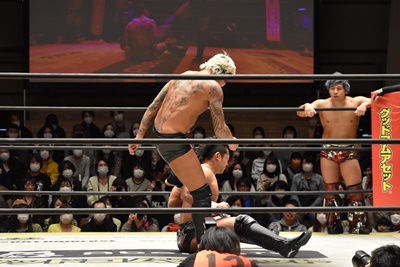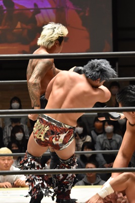 坂口エルボー、首投げからサッカーボールキック(右写真)。赤井にタッチ。
