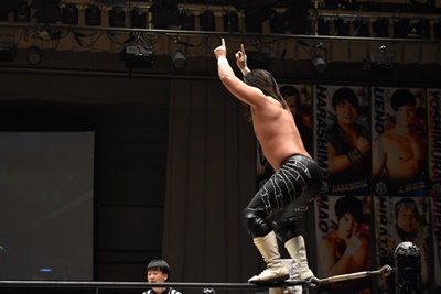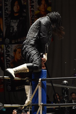 佐々木クリスをリングに戻すとコーナーに上り(左写真)、