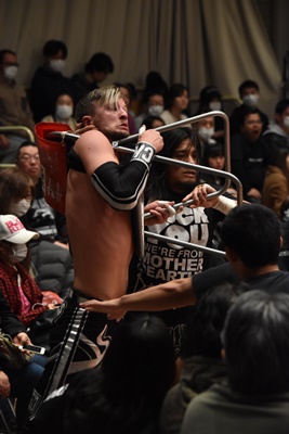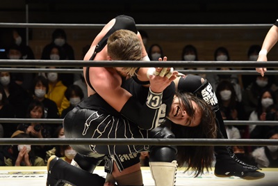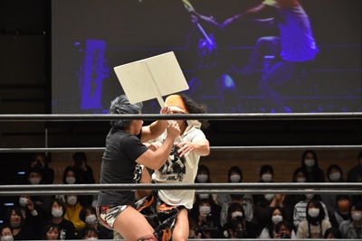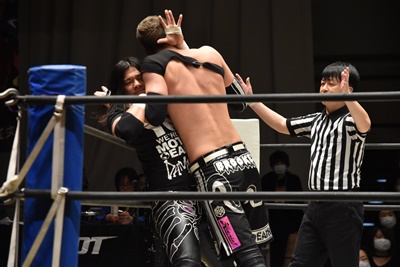 佐々木クリスをリングに戻すとクロスフェース、クリスロープ(左写真)。そのまま場外エスケープ。