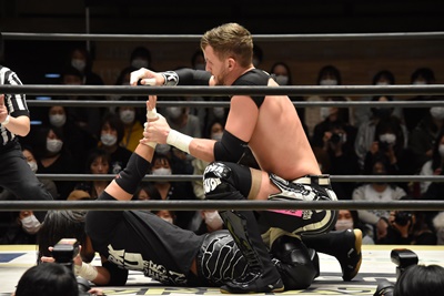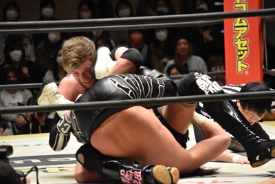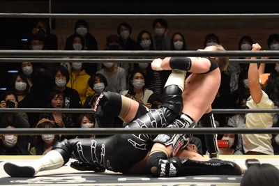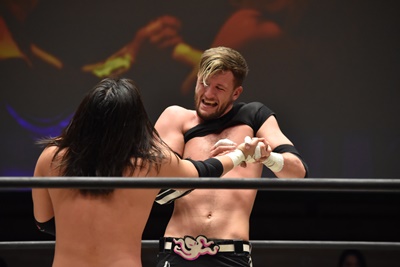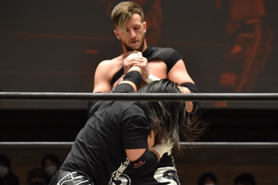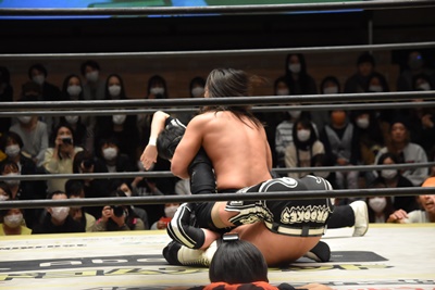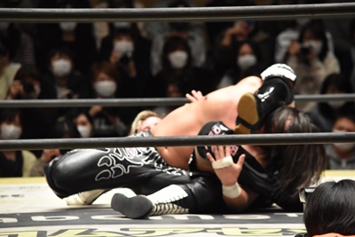 佐々木トラースキックからミスティカ式クロスフェース狙うがクリスキャッチしてツームストーンドライバーに(左写真)。カウントは2。