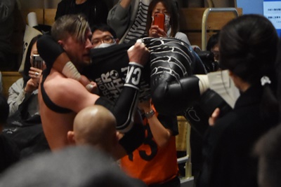 クリスは東のひな壇の座席と座席の間に佐々木を置くと(左写真)最上段からダイビングセントーン。5分経過。