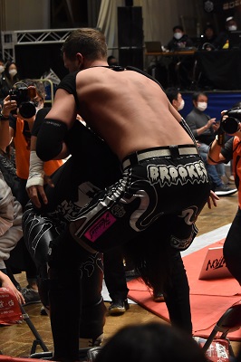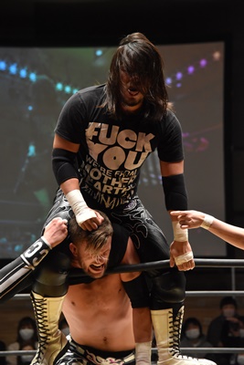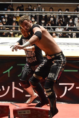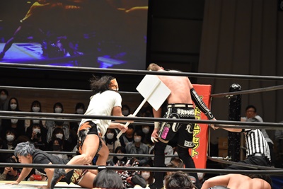 DAMNATION勢が一斉にリングインして佐々木に加勢するも、遠藤のオーバーヘッドキックは佐々木に誤爆(左写真)。