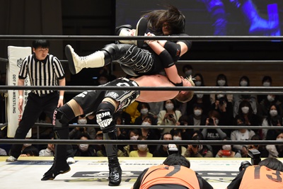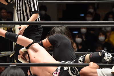 片エビに固めるが(左写真)ポーリーが木曽レフェリーの足を引っ張ってカウント阻止。