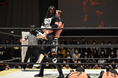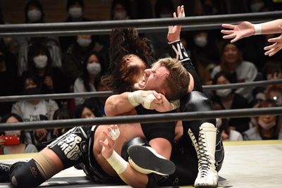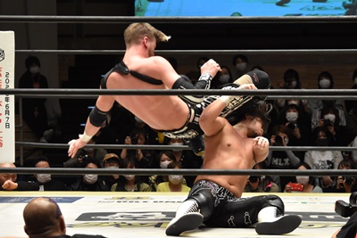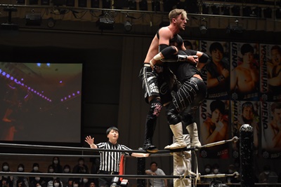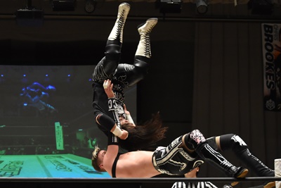 雪崩式ダブルアームスープレックス(右写真)、両者ダウン。