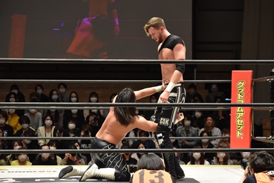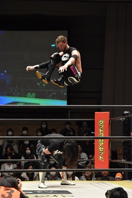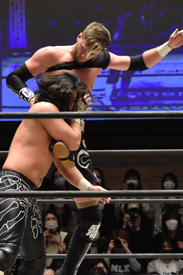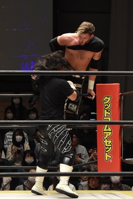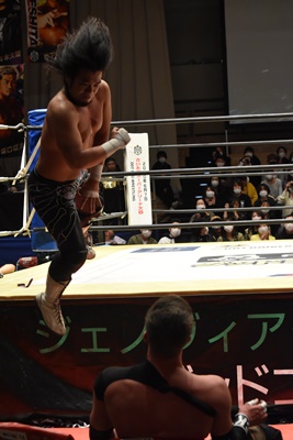 佐々木このチャンスにコーナーからダイビングエルボードロップ(左写真)、カウントは2。