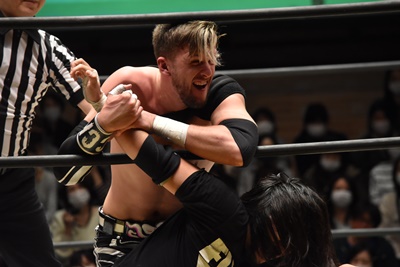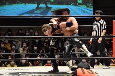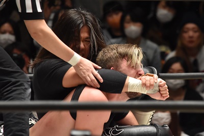 佐々木フロントネックロック、クリスはショルダースルー(右写真)。10分経過。