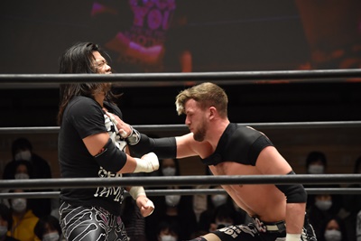 ブレークすると佐々木はクリスをロープに引っ掛けてドロップキック(右写真)。