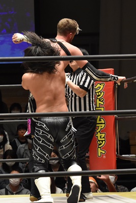 佐々木立ち上がるとクリスを木曽レフェリーの立っているコーナーに振る、クリス寸前で止まるが佐々木エルボーで追撃(右写真)、クリスは木曽レフェリーと激突。