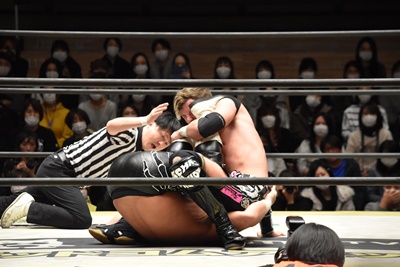 クリスエビ固めに(左写真)、カウント2。20分経過。