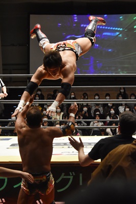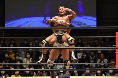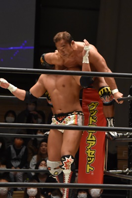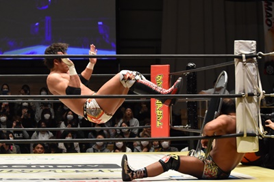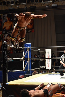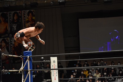 田中スーパーフライ狙ってコーナーに上るが竹下起き上がり、コーナーに上って雪崩式ブレーンバスター(左写真)
