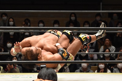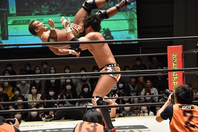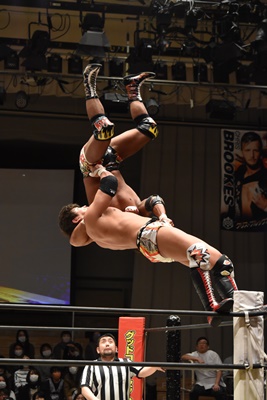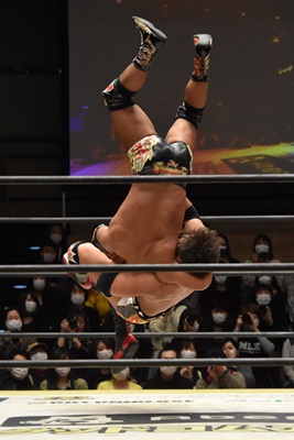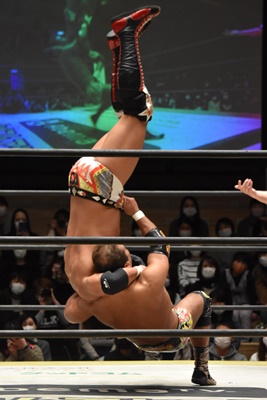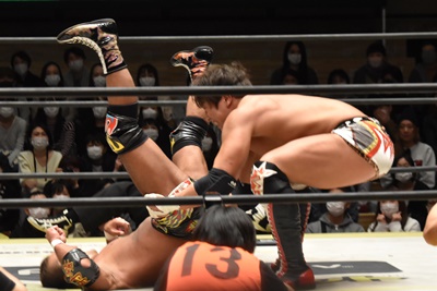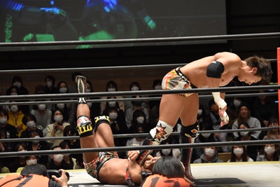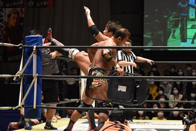 竹下ビッグブーツ、田中キャッチしてドラゴンスクリュー(右写真)。