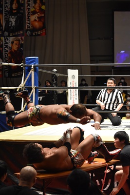 竹下チョップかわしてバック取ると急角度のバックドロップ(左写真)、田中は場外エスケープ。