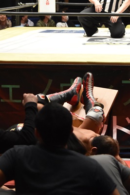 場外に置いたテーブルに竹下を寝せ、コーナーから飛び(右写真)、