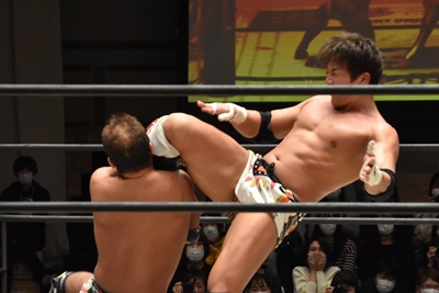 田中エルボー、竹下エルボー(右写真)。竹下エルボー連打、田中は低空ドロップキック。