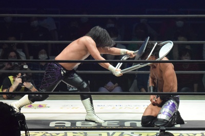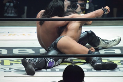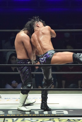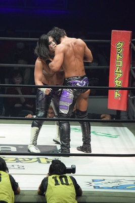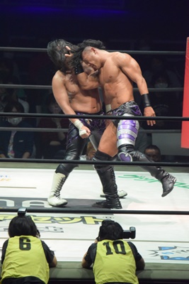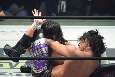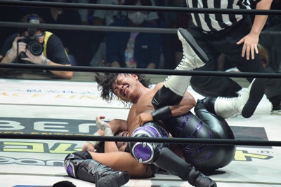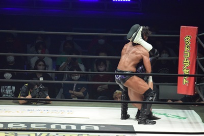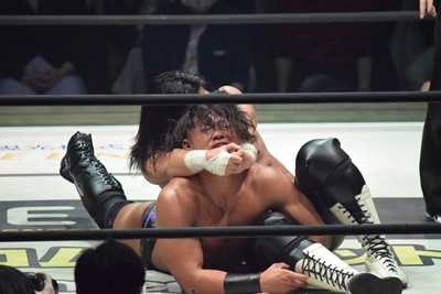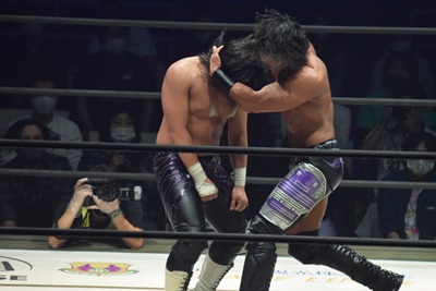 佐々木突っ込む、遠藤テツヤ・イン・ザ・スカイ(左写真)、カウント2。25分経過。