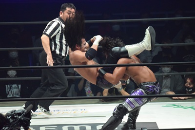 佐々木雪崩式ペディグリー狙う、遠藤脱出して肩車に(右写真)。