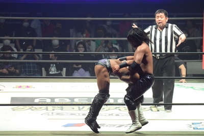 遠藤がカウント2でキックアウトすると佐々木はクロスフェースに(左写真)。20分経過。