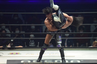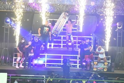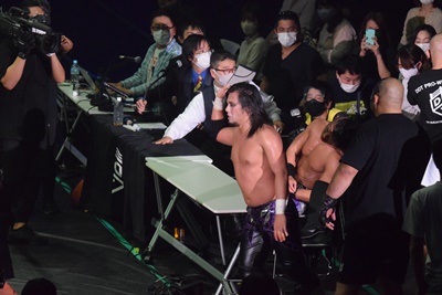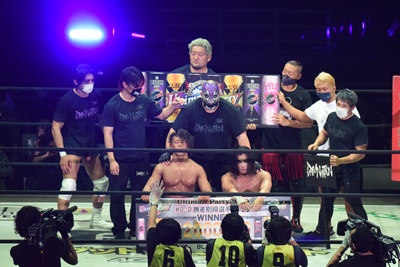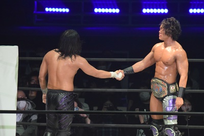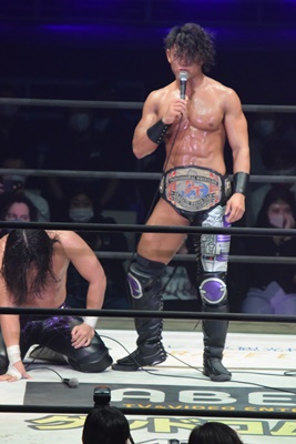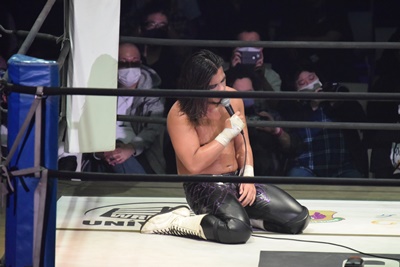 遠藤「世界的に、新型コロナウィルスで安心できない日々が続いてます。6月、さいたまスーパーアリーナ中止になって、本来今日やる予定だった両国も中止になりました。でも、こうやってお客さんを入れて、大田区総合体育館という大きな大会を開くことが出来ました。これも俺たちを信じてここに集まってくれた皆さんのおかげです。ただ、俺たちはまだまだ満足してません。必ず!必ず!さいたまスーパーアリーナ、両国国技館、そしてまたこの、大田区総合体育館でもっともっと大勢のお客さんを入れて、興行をするために俺たちはこれからも闘い続けます!もちろんその時も最後にこのリング上に立ってるのは、俺たちDAMNATIONだ!俺たちDAMNATIONは、群れない、媚びない、結婚しない。俺たちプロレスはこれからも止まらずに前に進んで行くから、お前ら俺たちから目を離すんじゃねえぞ!以上!」(左写真)
