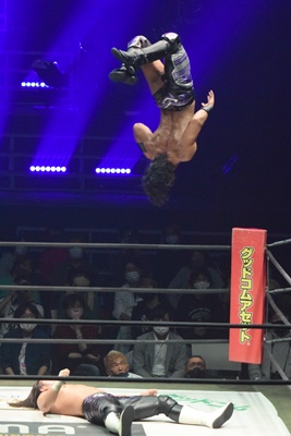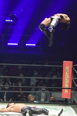 遠藤ボディスラム、コーナーに上ってシューティングスタープレス(左写真)、