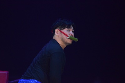 コスチューム脱いで男色タイツ姿に(右写真)。