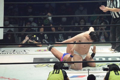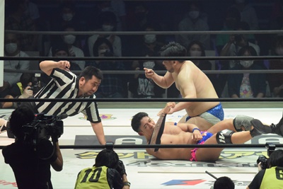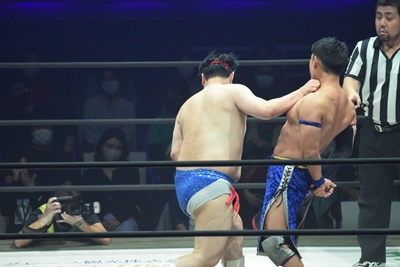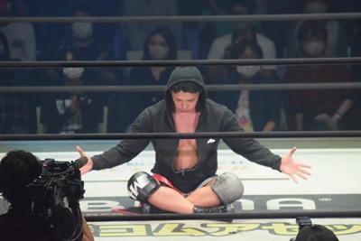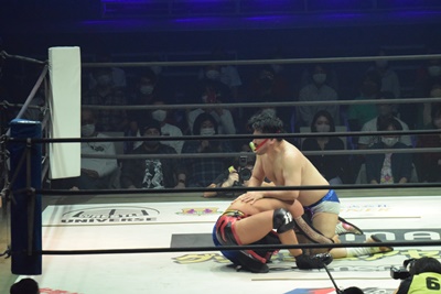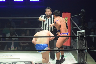 2回彰人の手が力なく落ちたところでセコンドの飯野がエプロンに駆け上がり、「ちょっと待ってください!彰人さん、諦めんじゃねえよ!集中ですよ!全集中!口の呼吸!」(右写真)