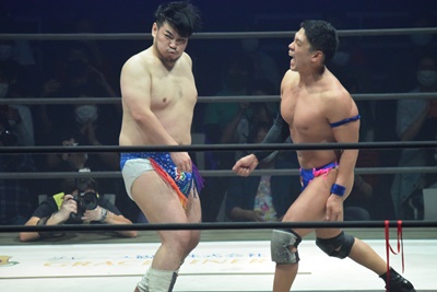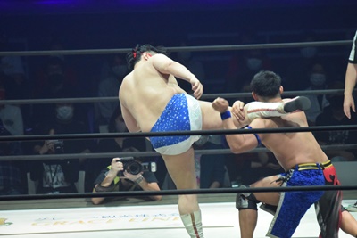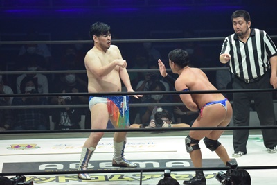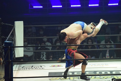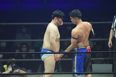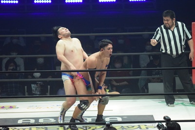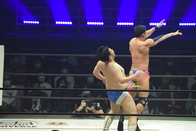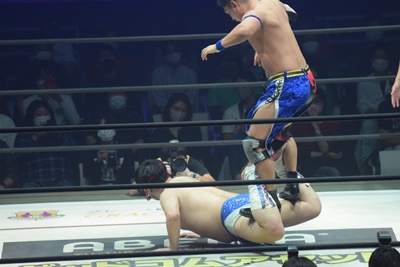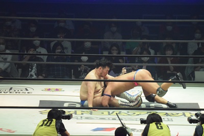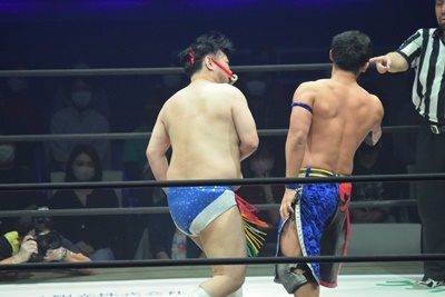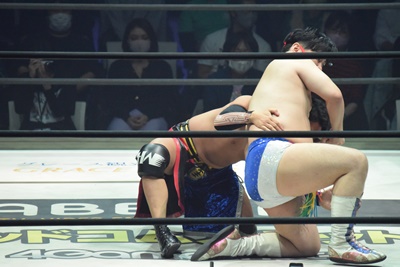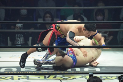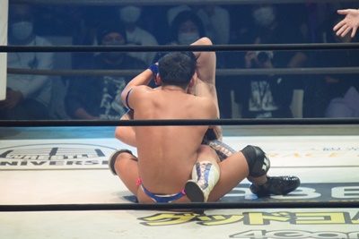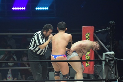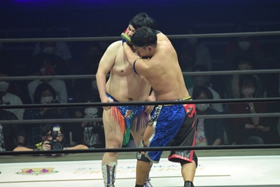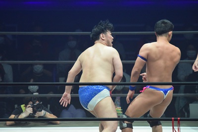 試合開始。ロックアップ、ディーノ腕を取る(右写真)、彰人切り返して自分の股間に持って行こうとする、
