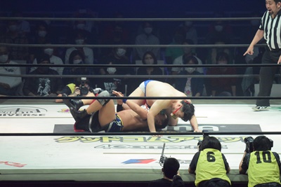 しかしディーノの表情が変わり、「紅蓮華」がかかる。彰人2で返す(左写真)。松井レフェリー「臭い!」