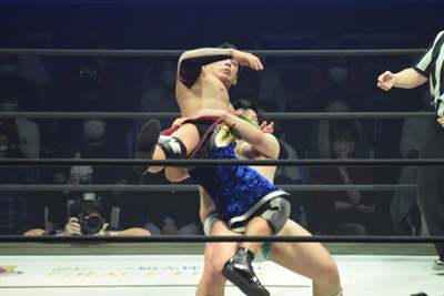 ディーノは男色ドライバーではなく普通のパイルドライバー狙う、彰人は抱え上げて(左写真)、