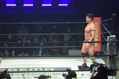 井上マイクの「今日は彰人選手の覚悟をご覧ください」の口上に続き彰人が入場(右写真)。