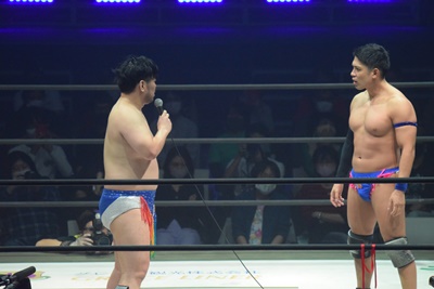 彰人マイクを取り「男色さん!何やってんすか!僕が、僕が闘いたい男色ディーノはそんなんじゃないですよ!僕が闘いたい男色ディーノは、最高にどうでもよくて、最高にくだらない男色殺法をするのが、それが男色ディーノでしょ!僕はそんなディーノさんと闘いたいんですよ!男色さん、目覚ましてください!僕の覚悟受け取ってください。」(左写真)