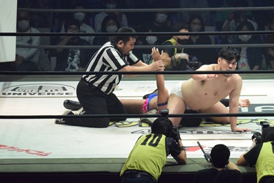 松井レフェリーが彰人の手を取ってチェック(左写真)、