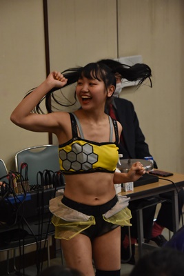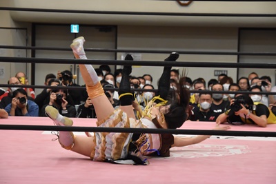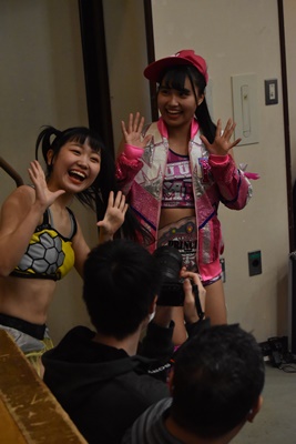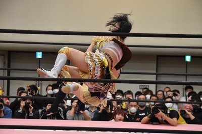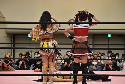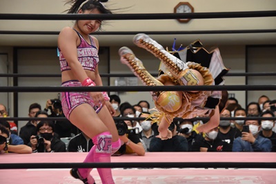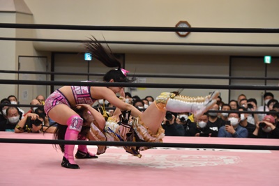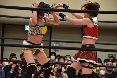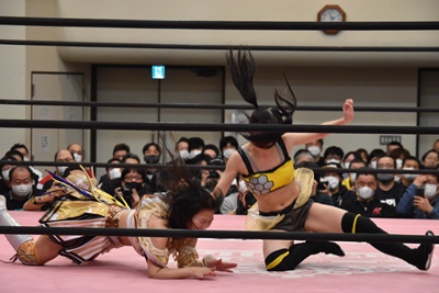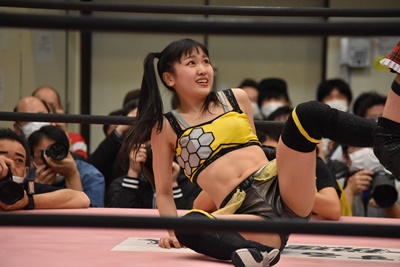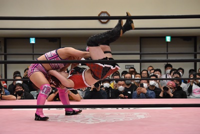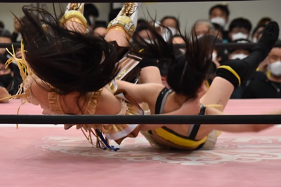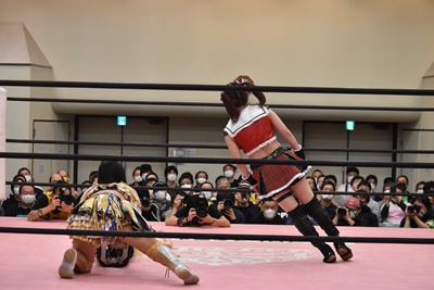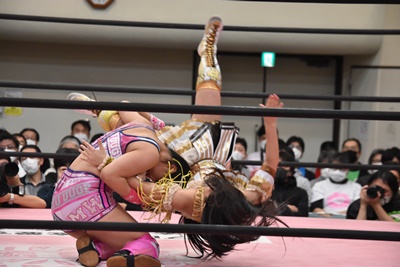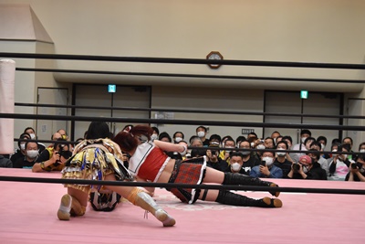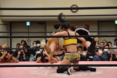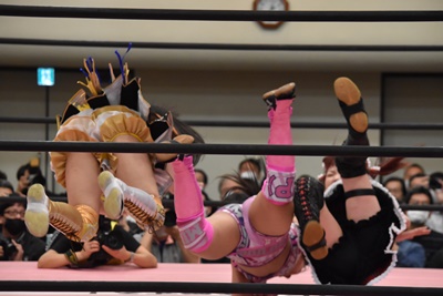 らく未詩にも脳天チョップ、伊藤ちゃんと合体式DDT(右写真)。伊藤ちゃんが未詩を場外に連れ出す。