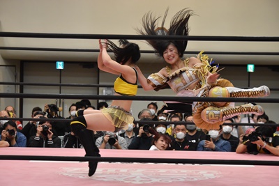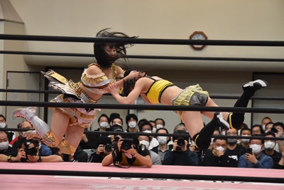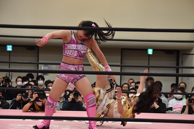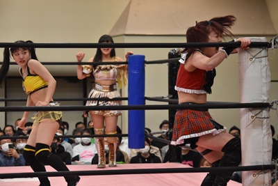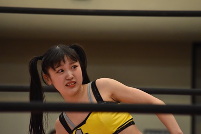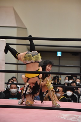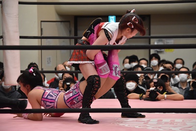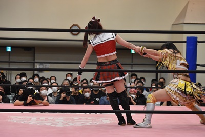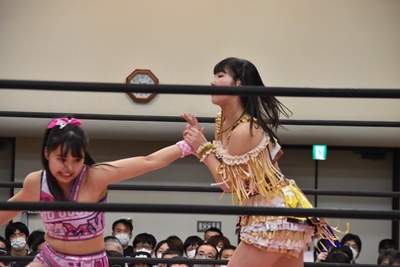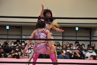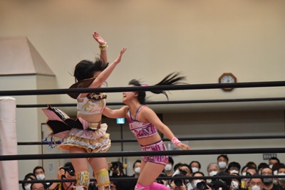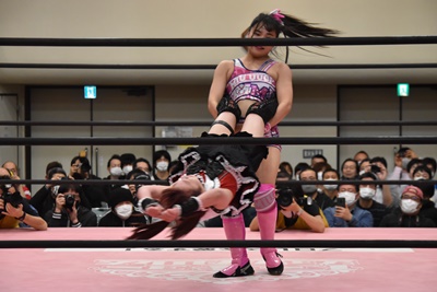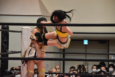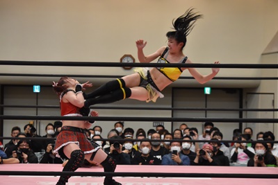 伊藤ちゃんロープに飛ぶ、鈴芽カウンターのドロップキック(左写真)、未詩にタッチ。5分経過。