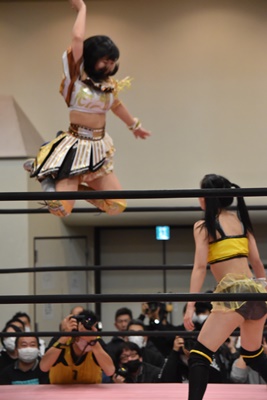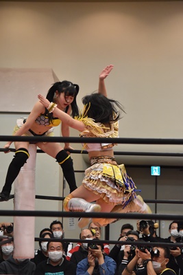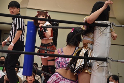 らくコーナーに上りダイビング脳天チョップ(左写真)、カバーは未詩がカット。