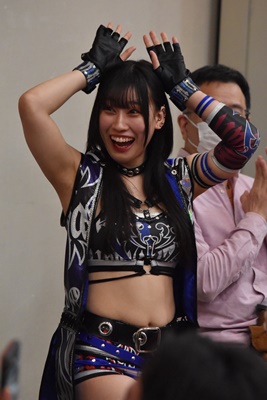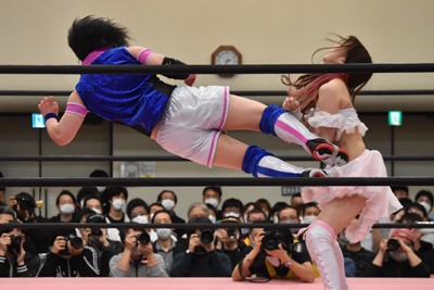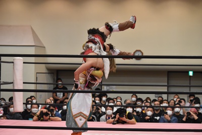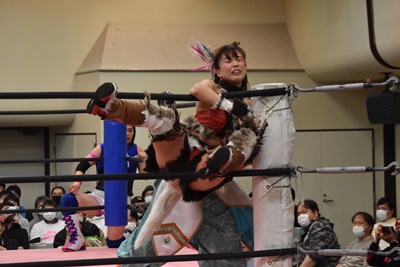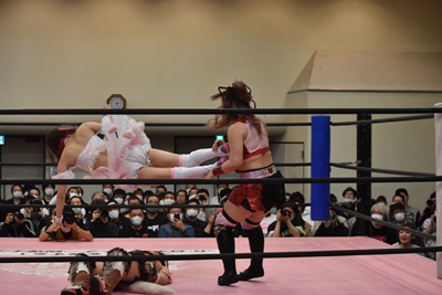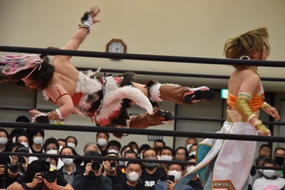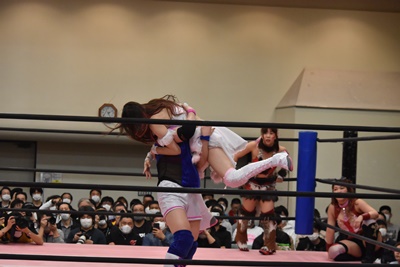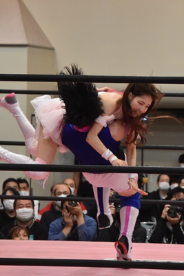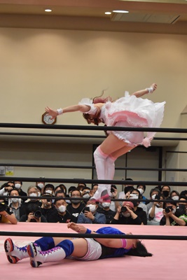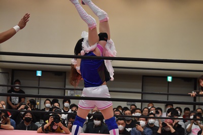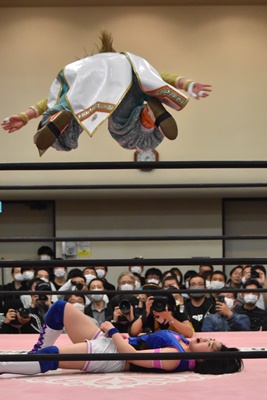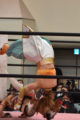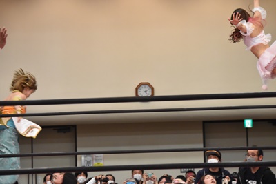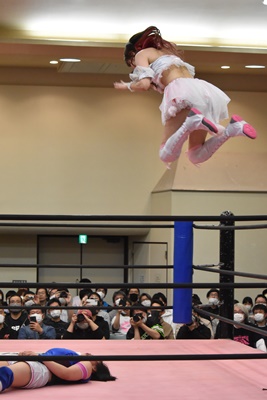 みずぴょんカバーをブリッジですり抜けるとロープに飛んでドロップキック(左写真)、ヒカリにタッチ。