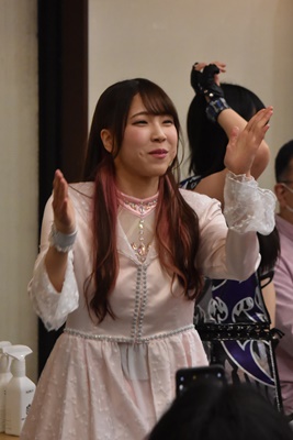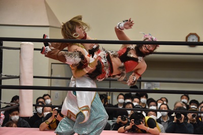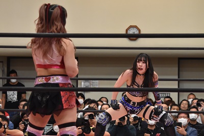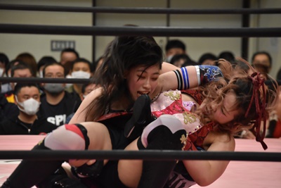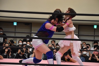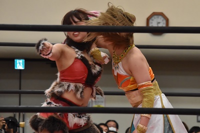 先発はヒカリとユキ(右写真)。エルボー打ち合い、ユカッチと魅星にタッチ。