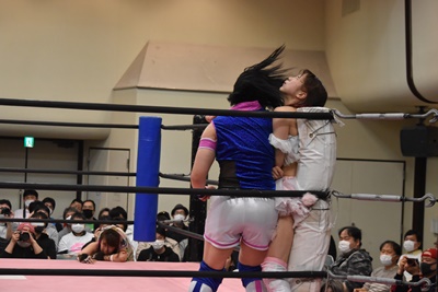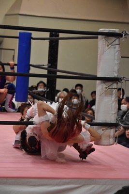 コーナーに座り込んだユキにドロップキック連打(左写真)。5分経過。