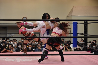 ユカッチフライングメイヤーからグラウンドヘッドロック(左写真)。ヒカリと中島にタッチ。