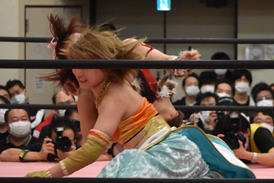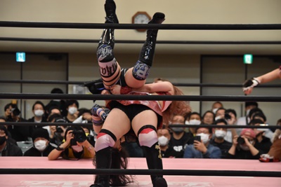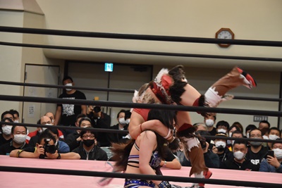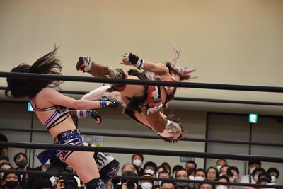 ヒカリが中島にネックブリーカードロップ(右写真)。