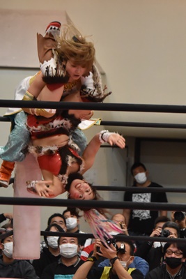 中島みずぴょんの両足取ってシーソー式でサードロープにノドをぶつける(左写真)。魅星にタッチ。